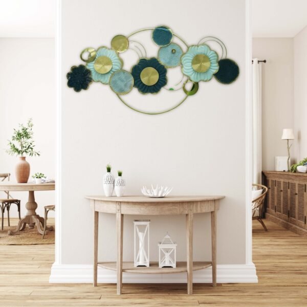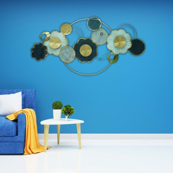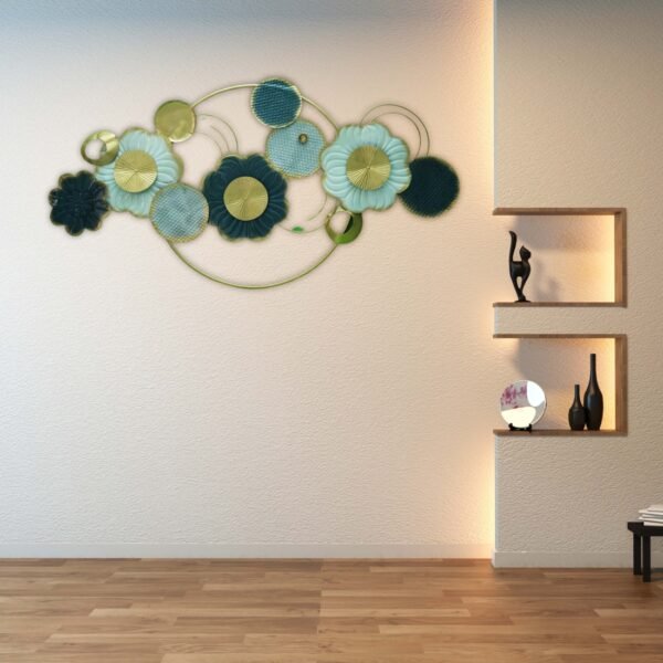 Add a touch of elegance and sophistication to your space with this stunning Floral Harmony Metal Wall Art. Featuring a vibrant arrangement of metallic flowers in shades of gold, teal, and blue, this piece measures 48×24 inches. The layered design with circular accents brings depth and dimension, making it a perfect statement piece for your living room, hallway, or bedroom.