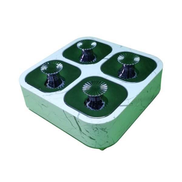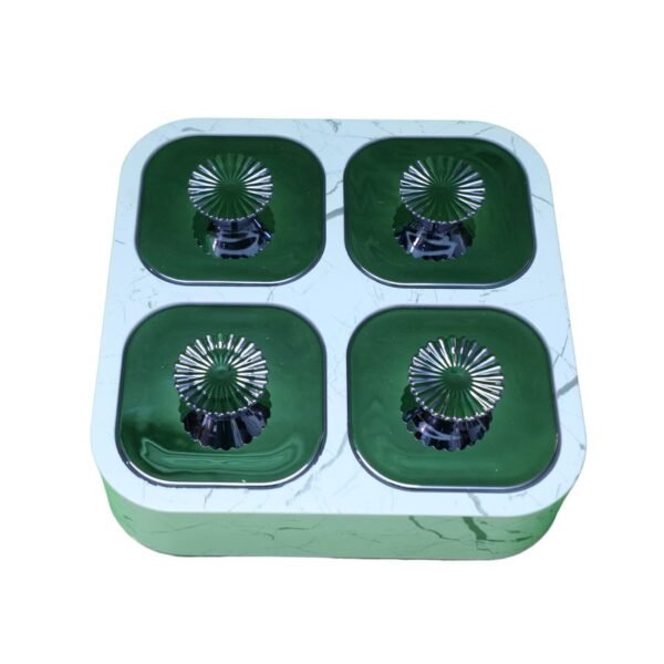 Elevate your dining or serving experience with this elegant single-piece container box, designed with four compartments for easy storage of dry fruits, snacks, or sweets. The glossy green finish paired with decorative crystal-like knobs adds a refined touch. Perfect for festive occasions, gifting, or stylish home decor.